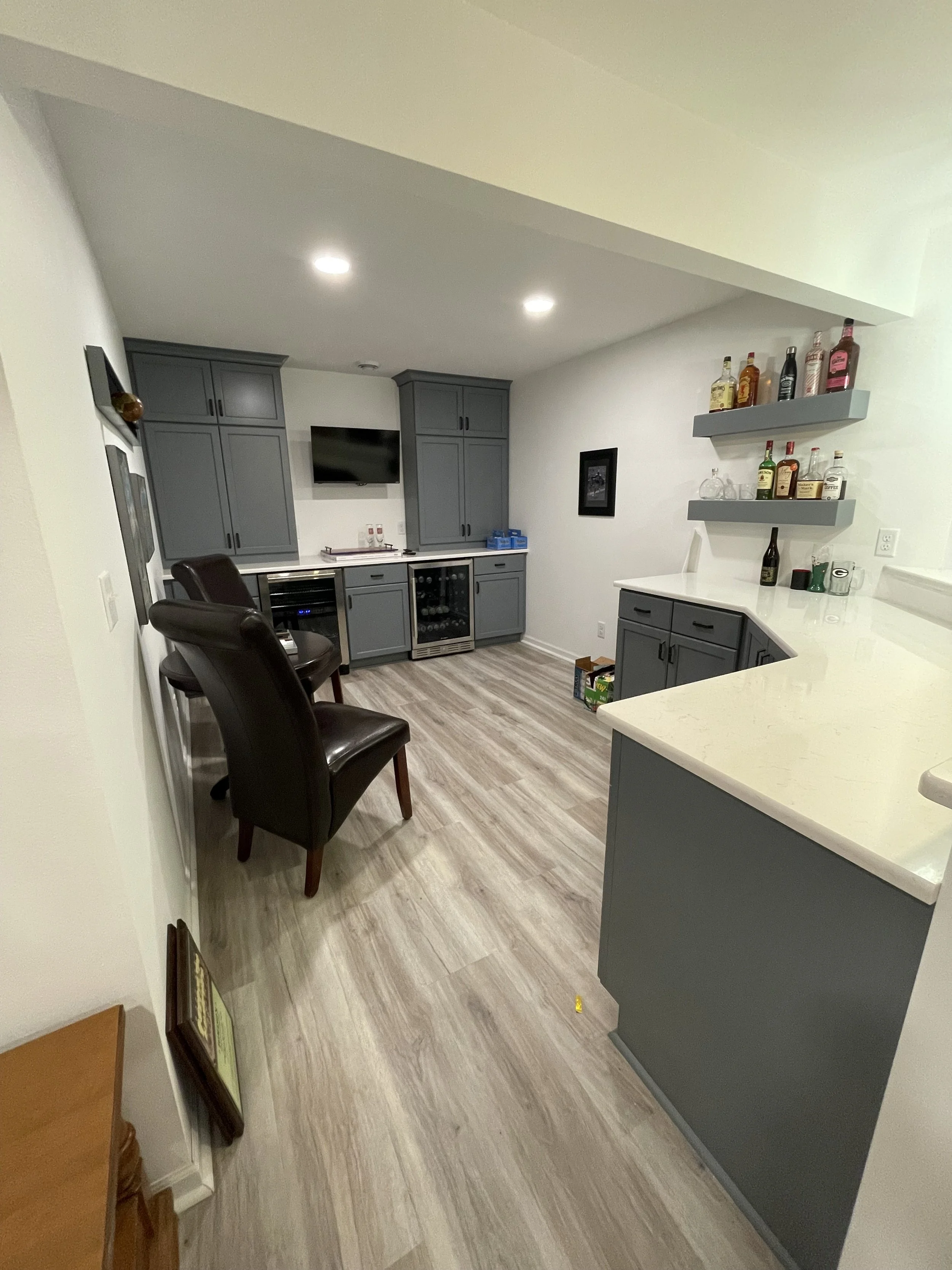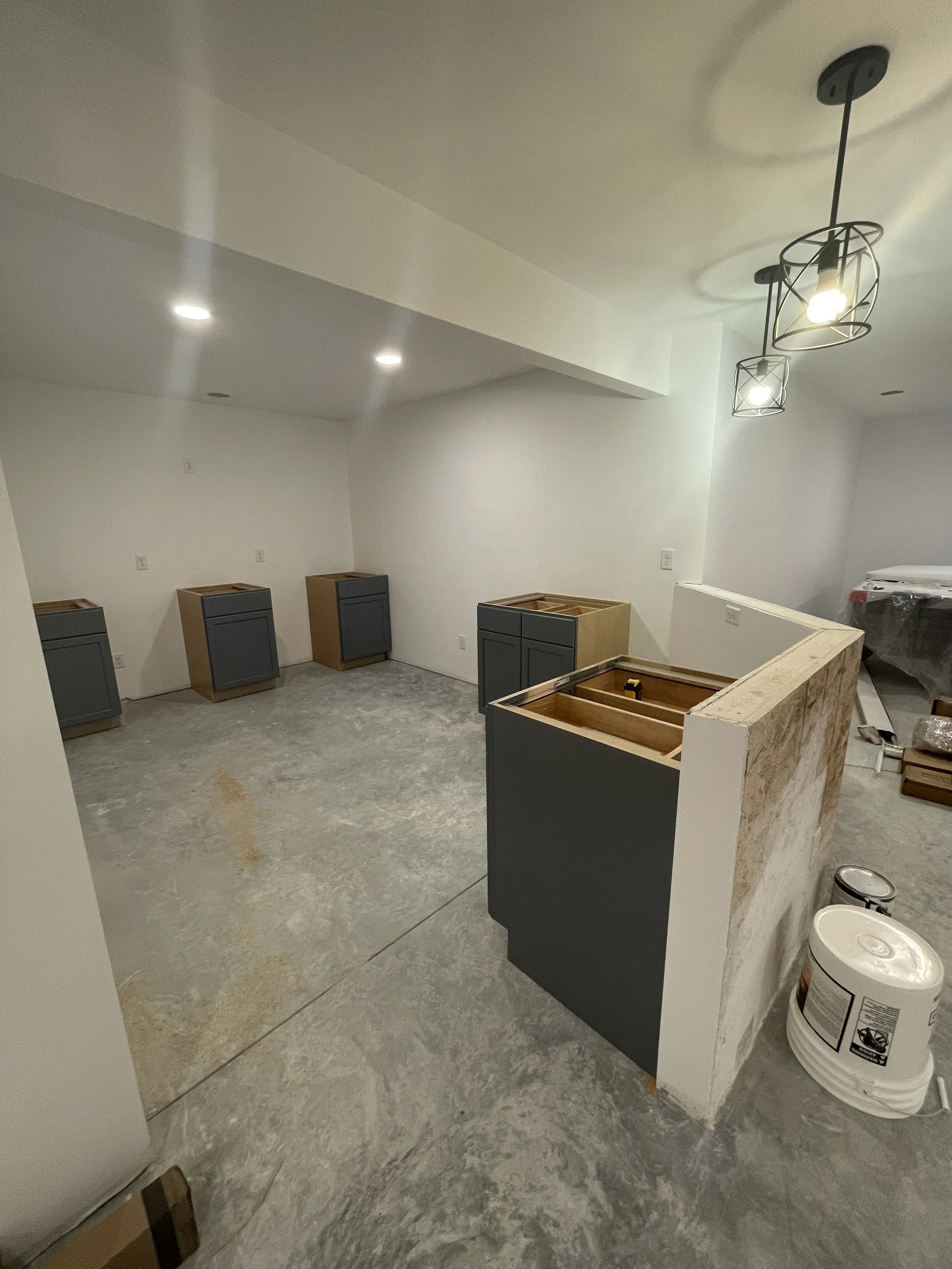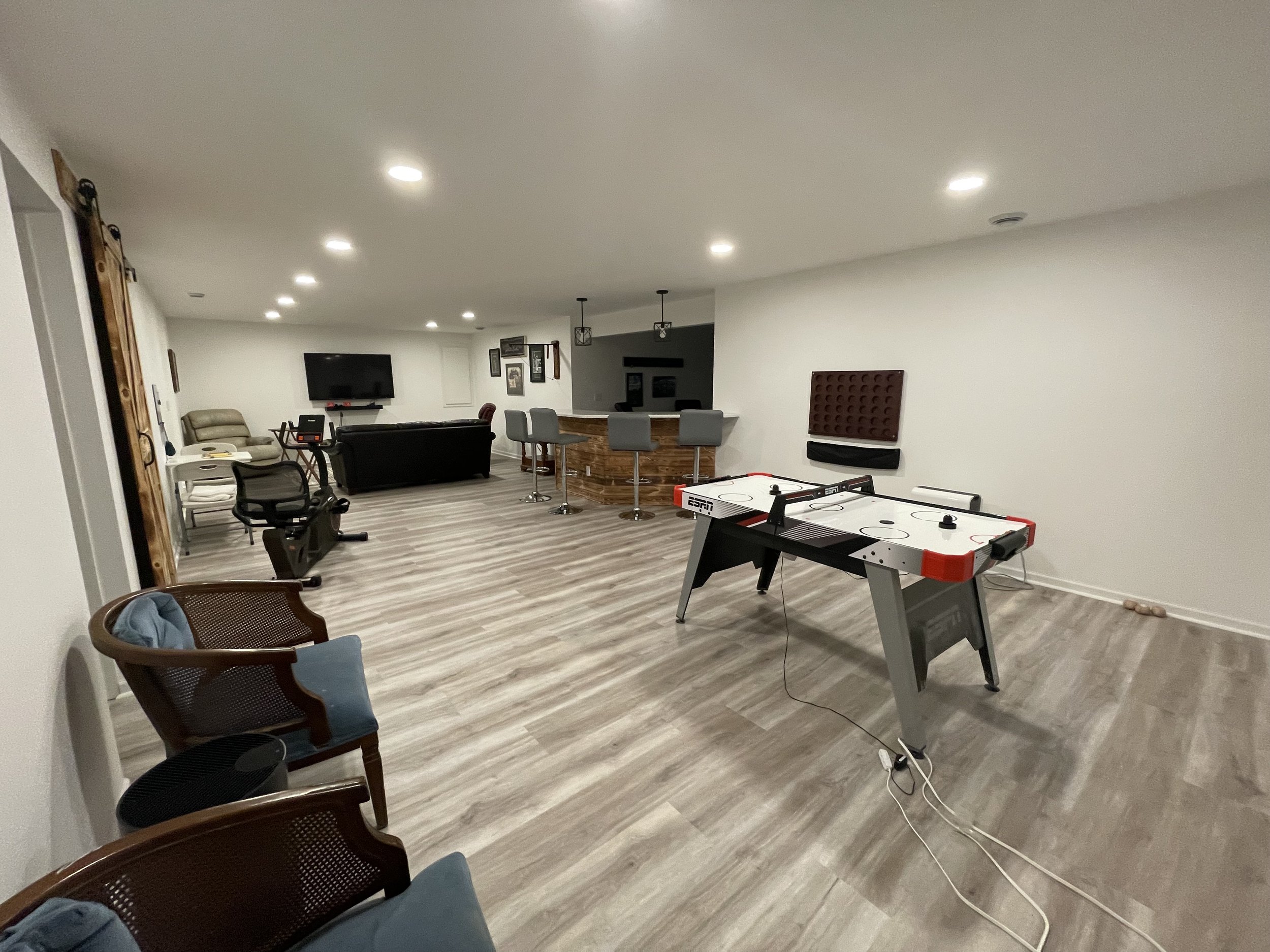 In 2019 my parents moved into a new build condo. To keep cost low at the time they did not finish the basement. Fast forward to 2024, my mom hired me to design the basement. she wanted storage space, an office/ craft room for herself, game area, bar, and space for a large sectional couch to relax and watch tv. We went to Home Depot to buy flooring and cabinets. We hired my husband’s company to do the framing and drywall. We hired a handful of other people to create the vision my mom and I designed. Our style board included rich woods, blues and grays, barn wood doors, a dartboard wall, and several areas to gather and have a conversation.