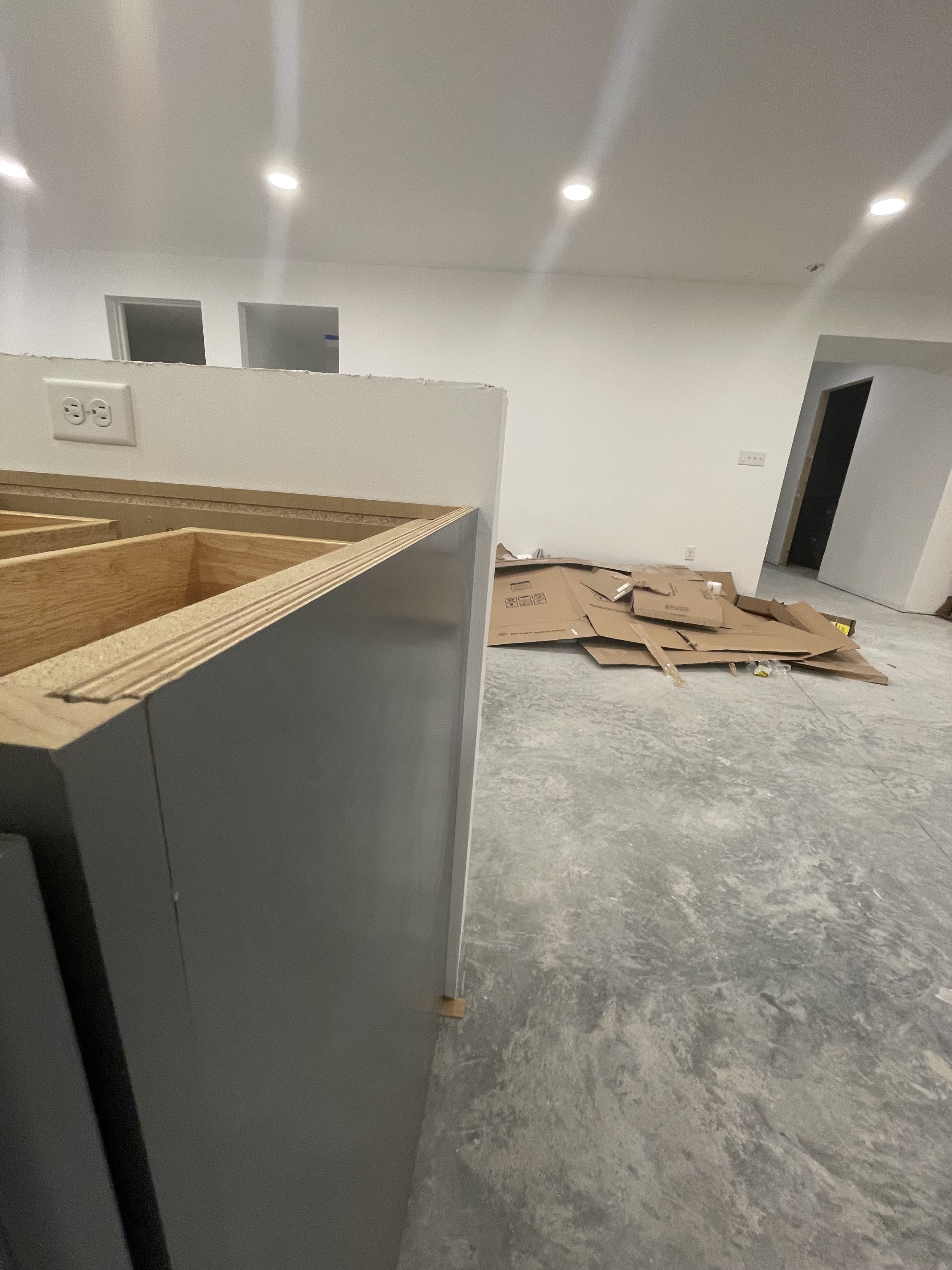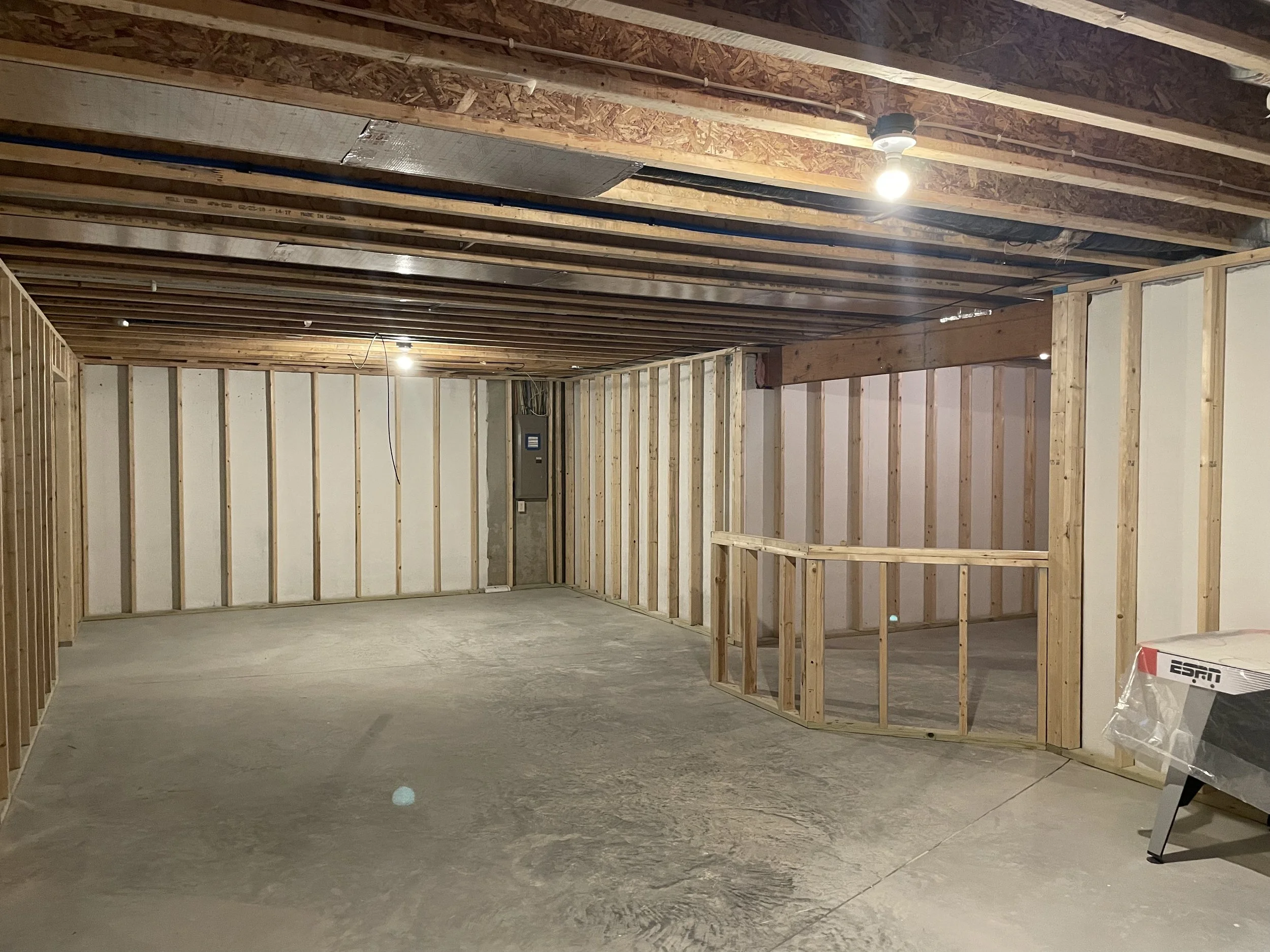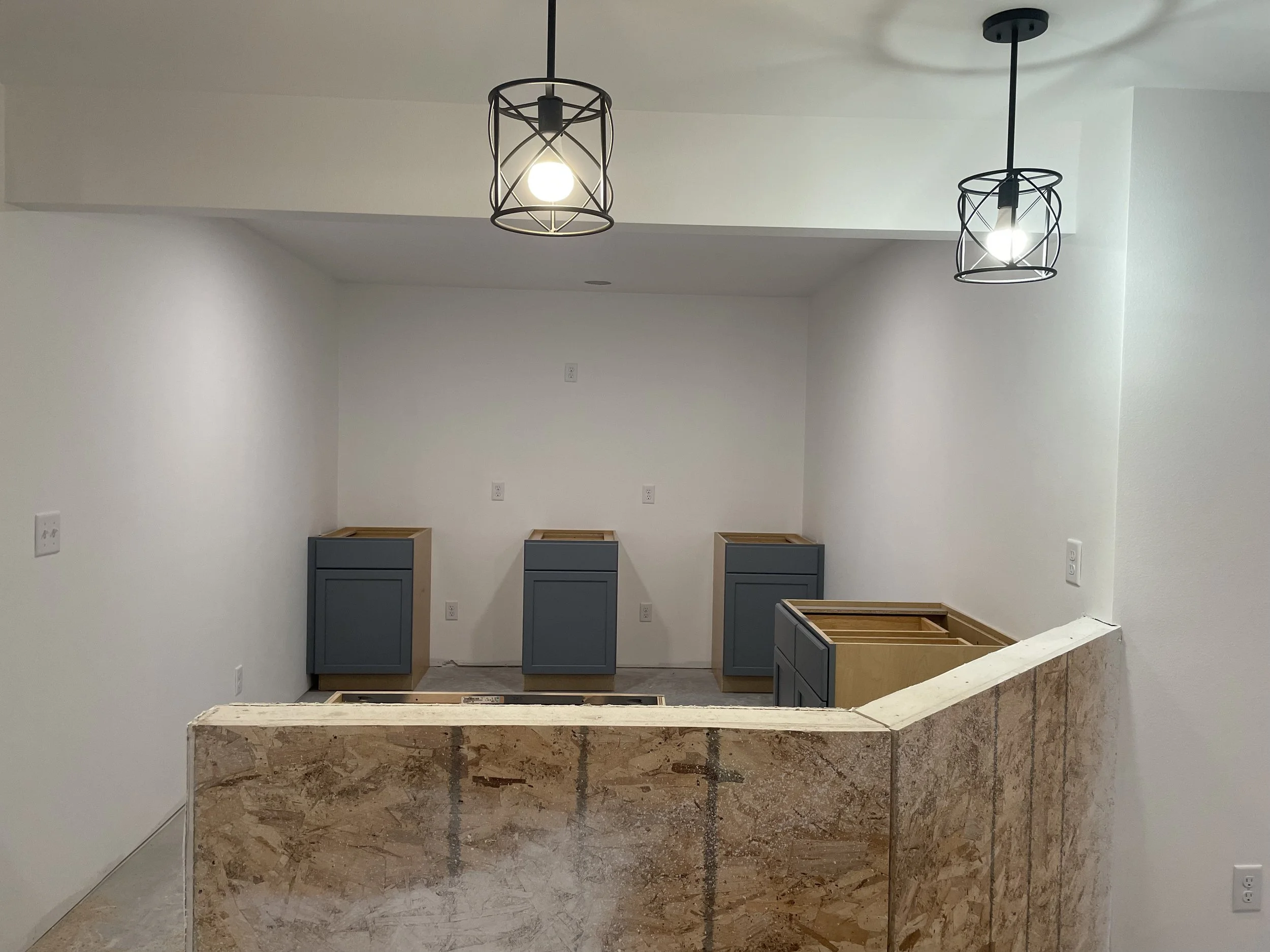 In 2019 my parents moved into a new build condo. To keep cost low at the time they did not finish the basement. Fast forward to 2024, my mom hired me to design the basement. she wanted storage space, an office/ craft room for herself, game area, bar, and space for a large sectional couch to relax and watch tv. We went to Home Depot to buy flooring and cabinets. We hired my husband’s company to do the framing and drywall. We hired a handful of other people to create the vision my mom and I designed. Our style board included rich woods, blues and grays, barn wood doors, a dartboard wall, and several areas to gather and have a conversation.