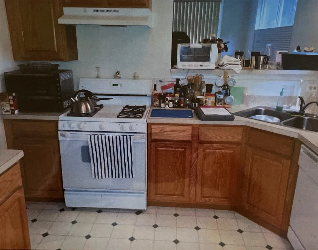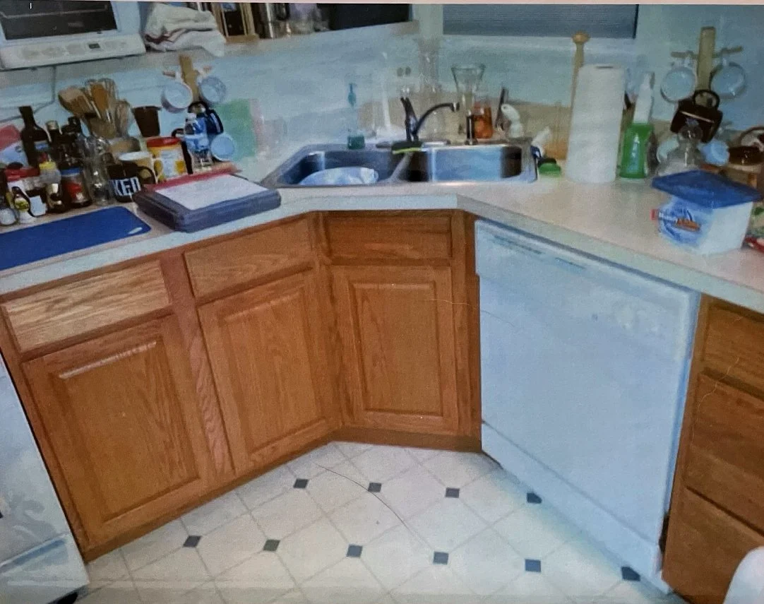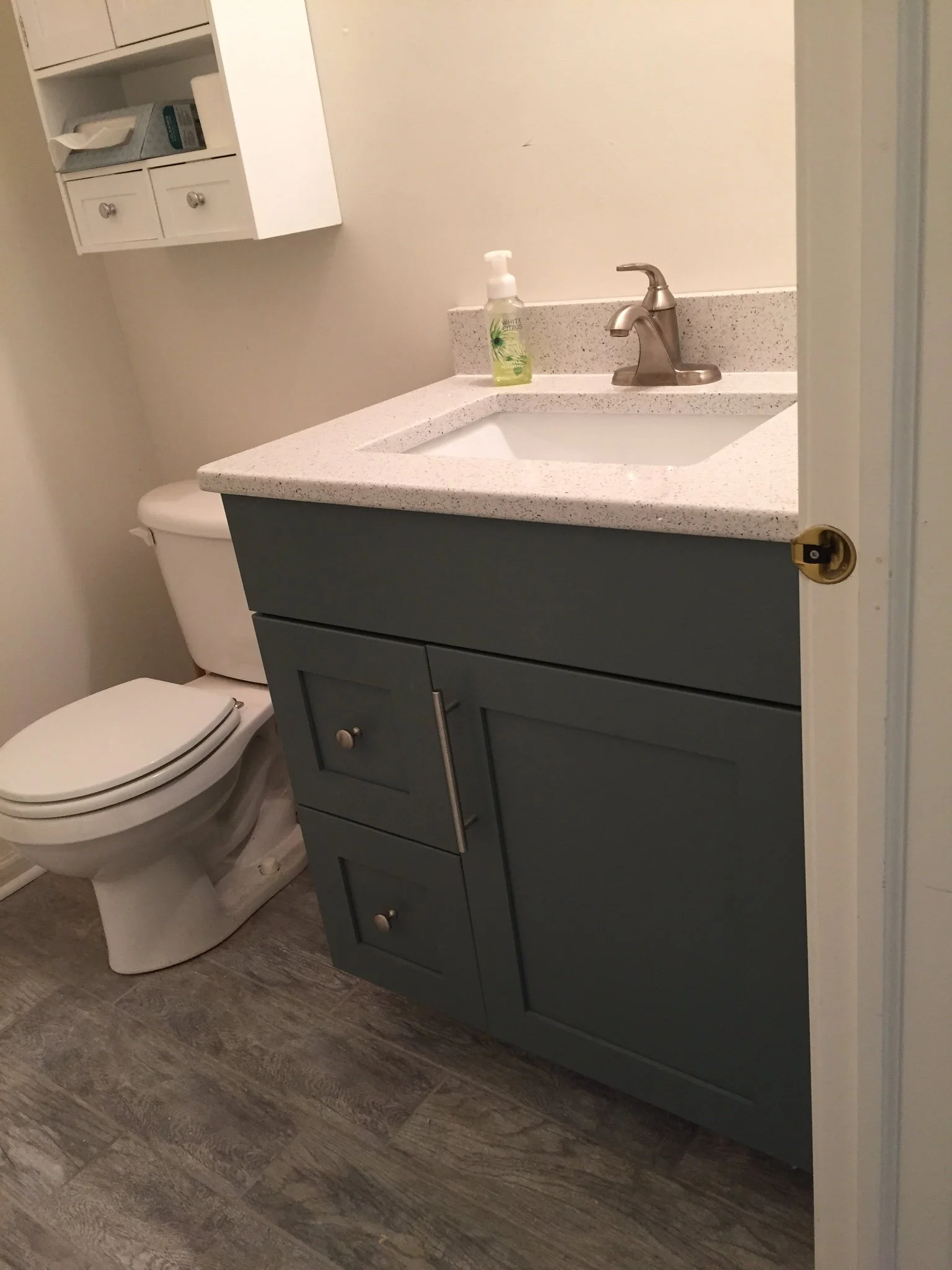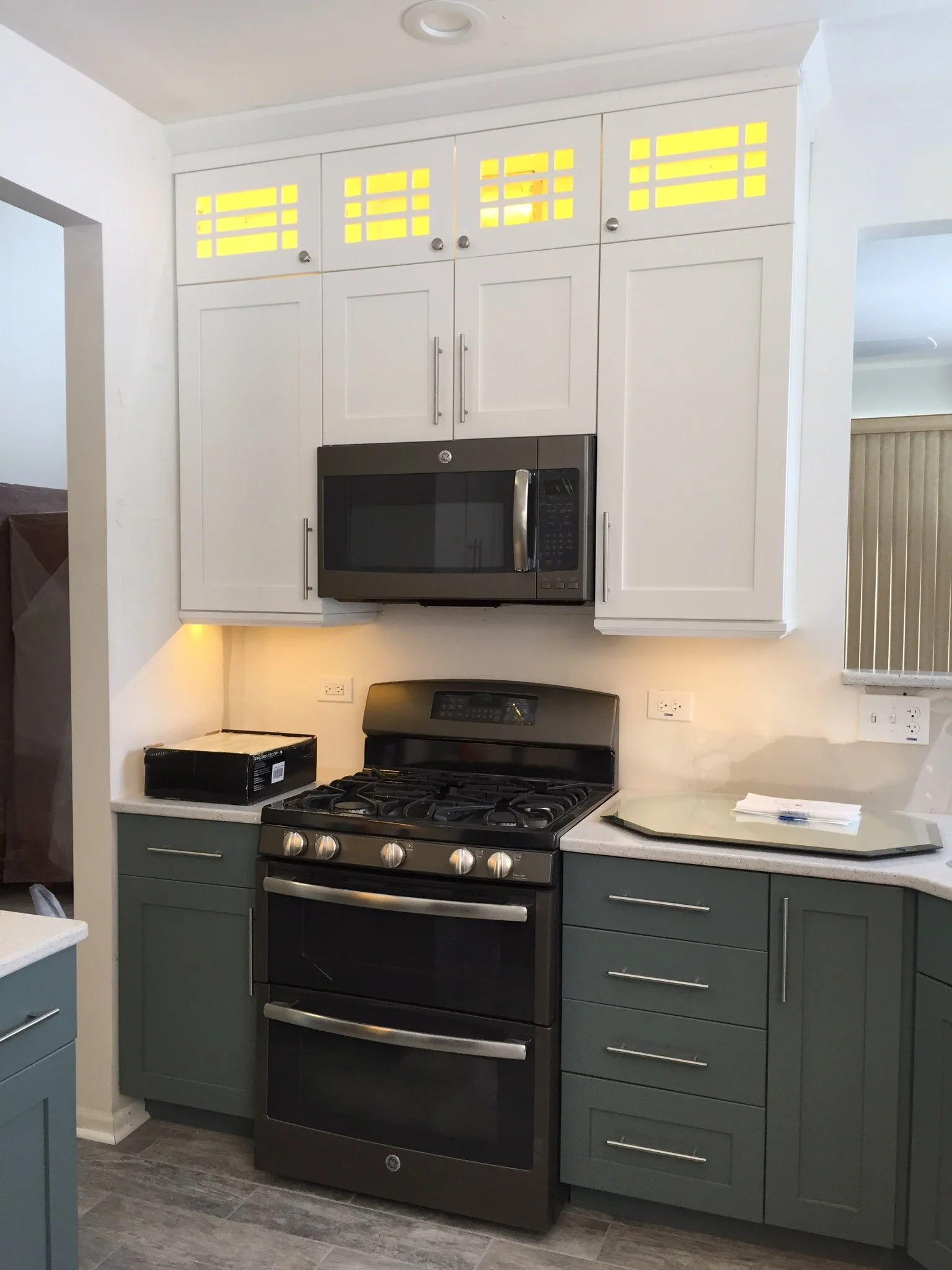 Grace had saved for years and years to build her dream kitchen. She owned a condo in Greyslake Illinois. She knew much of the about could not be changed due to size and space. Graces condo did have vaulted ceilings though so we knew we could use the height. She wanted clean and bright, shaker style, two tone, and a small cabinet on the top with lighting to display her trinkets. I signed Grace up for a kitchen analysis to be done by the installer. He then sent me images and measurements even plumbing and electrical placement. I took Graces vision throughout the whole first level of the condo. Home Depot installed new flooring through the first floor, new light fixtures, new toilet and vanity, new base molding, and brought plumbing and electrical to code. From old drab linoleum with oak cabinets and white appliances to calm blues and bright whites. Grace invited me into her life and we formed a great relationship!